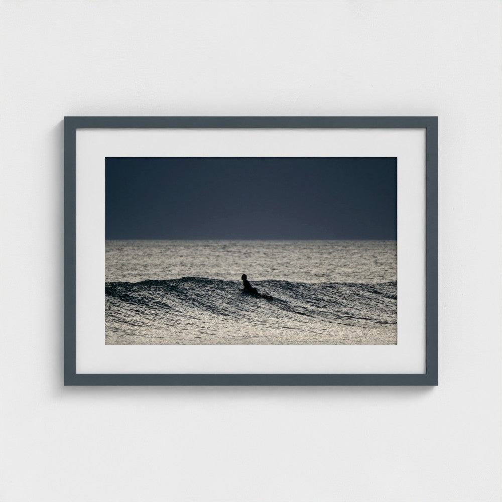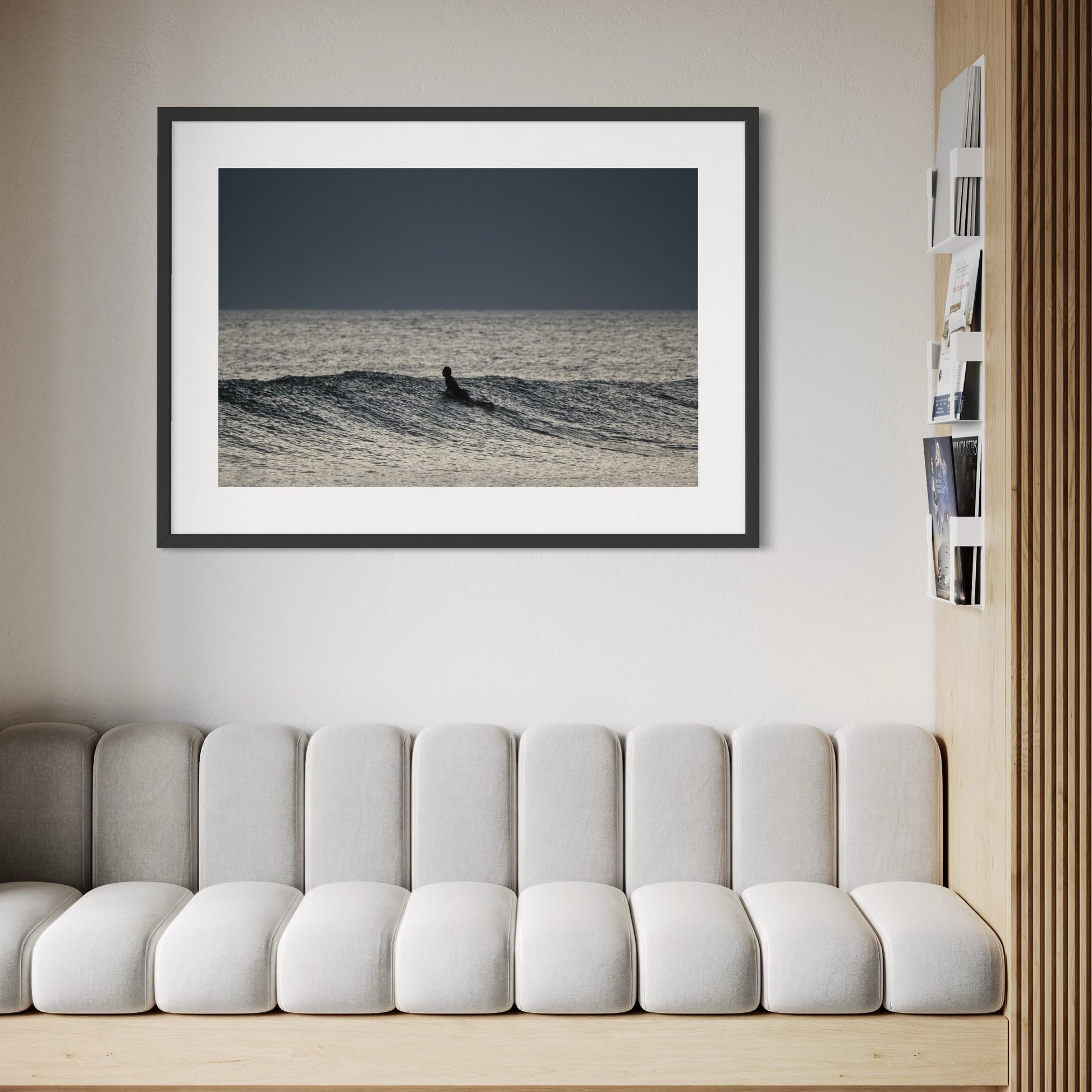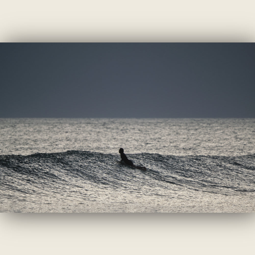 In the silver haze, a lone figure clings to the water’s edge. No crash, no rush — just stillness. The quiet before the surge.