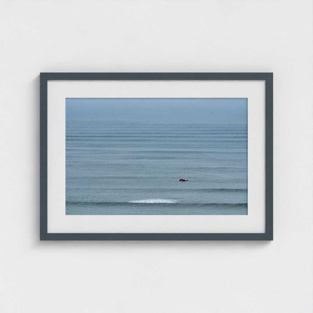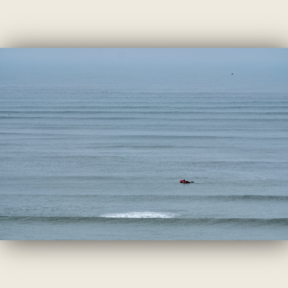 Everything breathes rhythm here. The waves align in silence, as if guided by an invisible hand. In the middle, a red silhouette slips by—barely a trace, barely a sound.